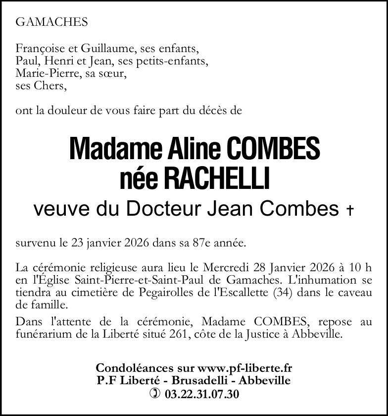 Avis de décès de Madame Aline COMBES (GAMACHES)