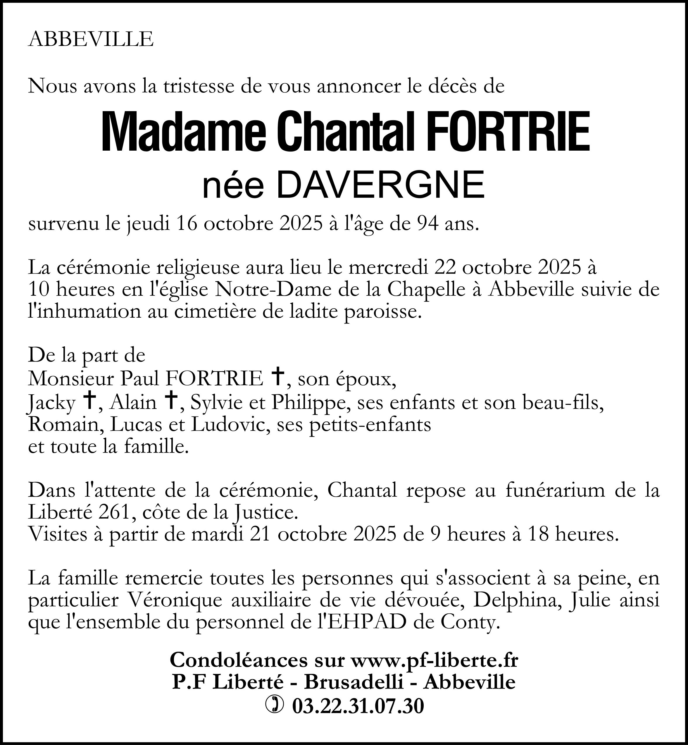 Avis de décès de Madame Chantal FORTRIE née DAVERGNE