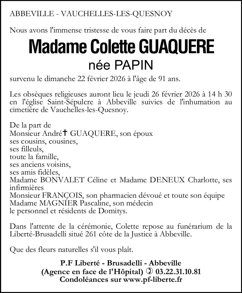Avis de décès de Madame Colette GUAQUERE née PAPIN