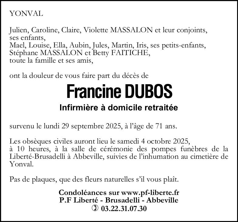 Avis de décès de Madame Francine DUBOS