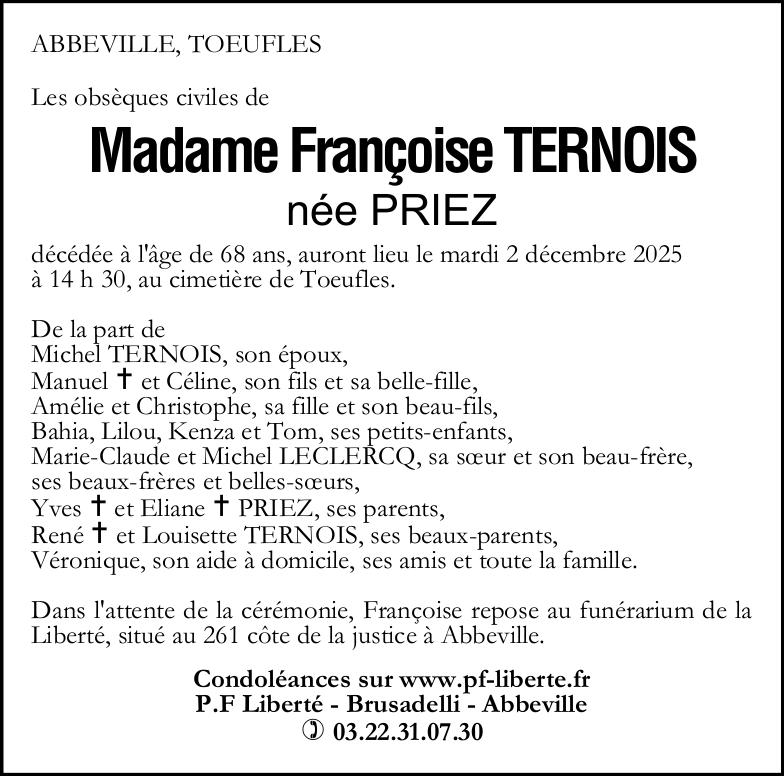 Avis de décès de Madame Françoise TERNOIS née PRIEZ