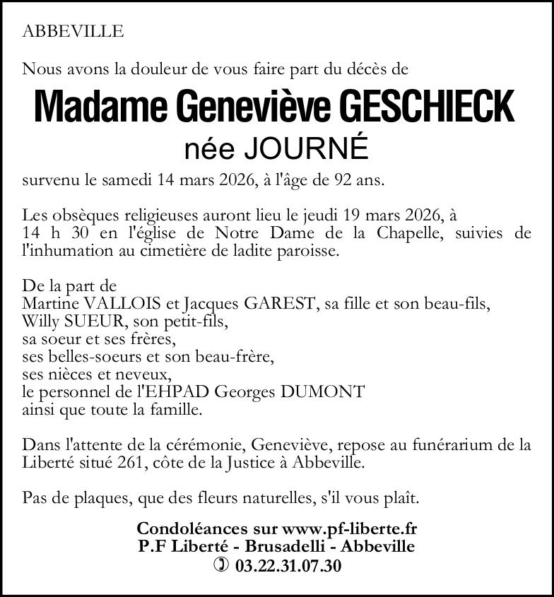 Avis de décès de Madame Geneviève GESCHIECK née JOURNÉ