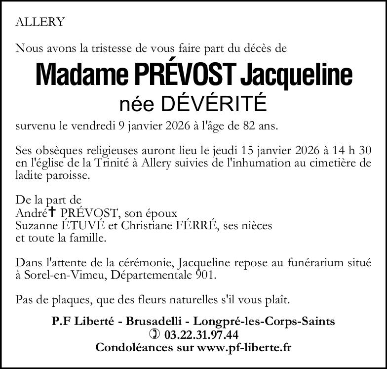Avis de décès de Madame Jacqueline PRÉVOST née DÉVÉRITÉ