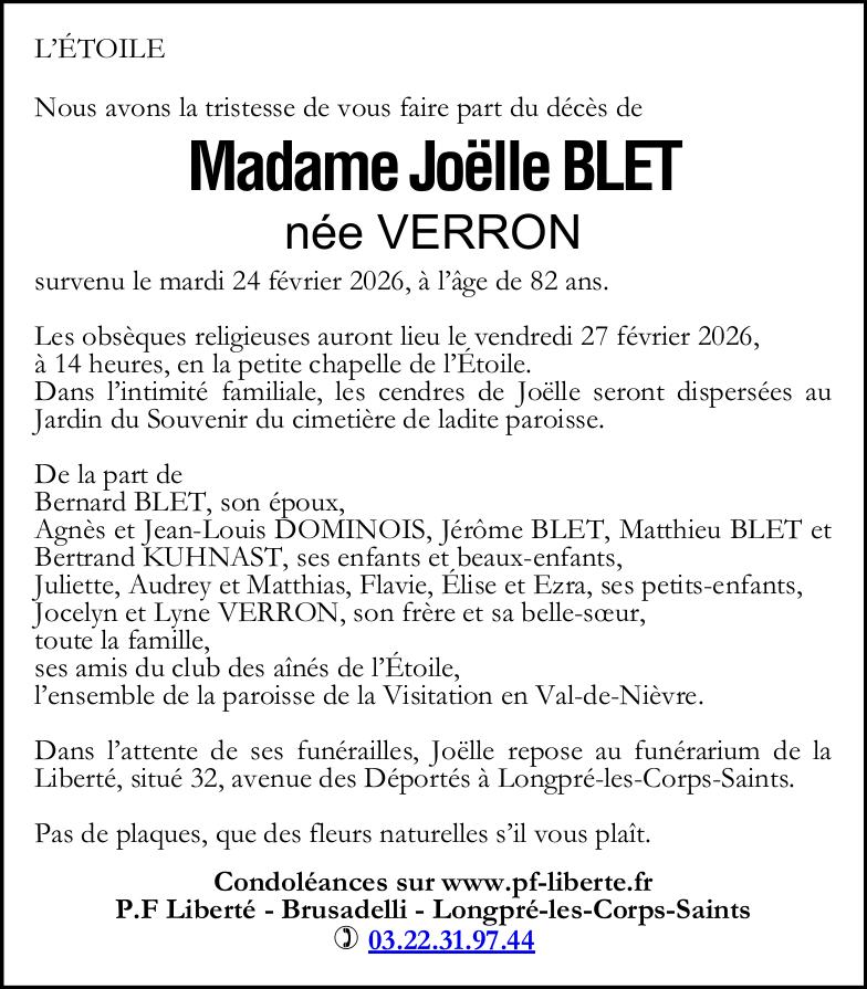 Cette page vous permet de présenter vos condoléances à la famille et de partager l'avis de décès de Joëlle.
