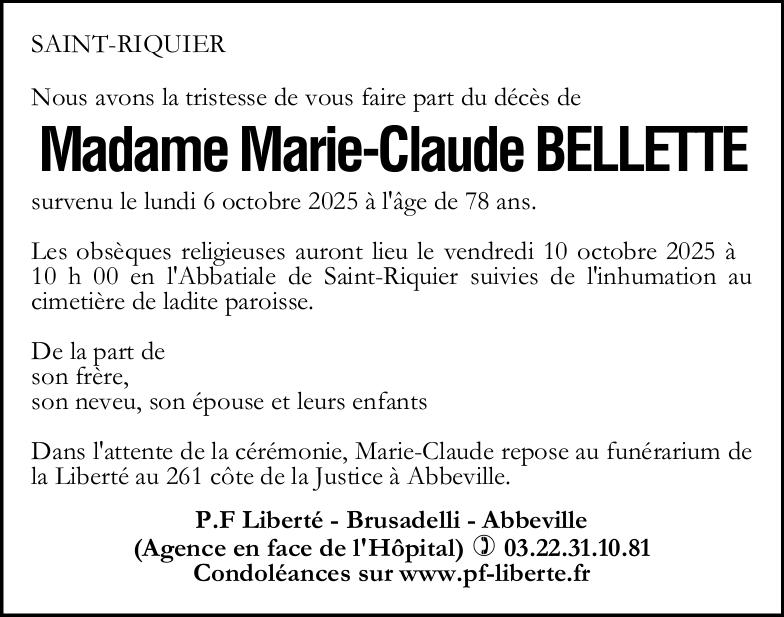 Déroulement des funérailles de Madame Marie-Claude BELLETTE