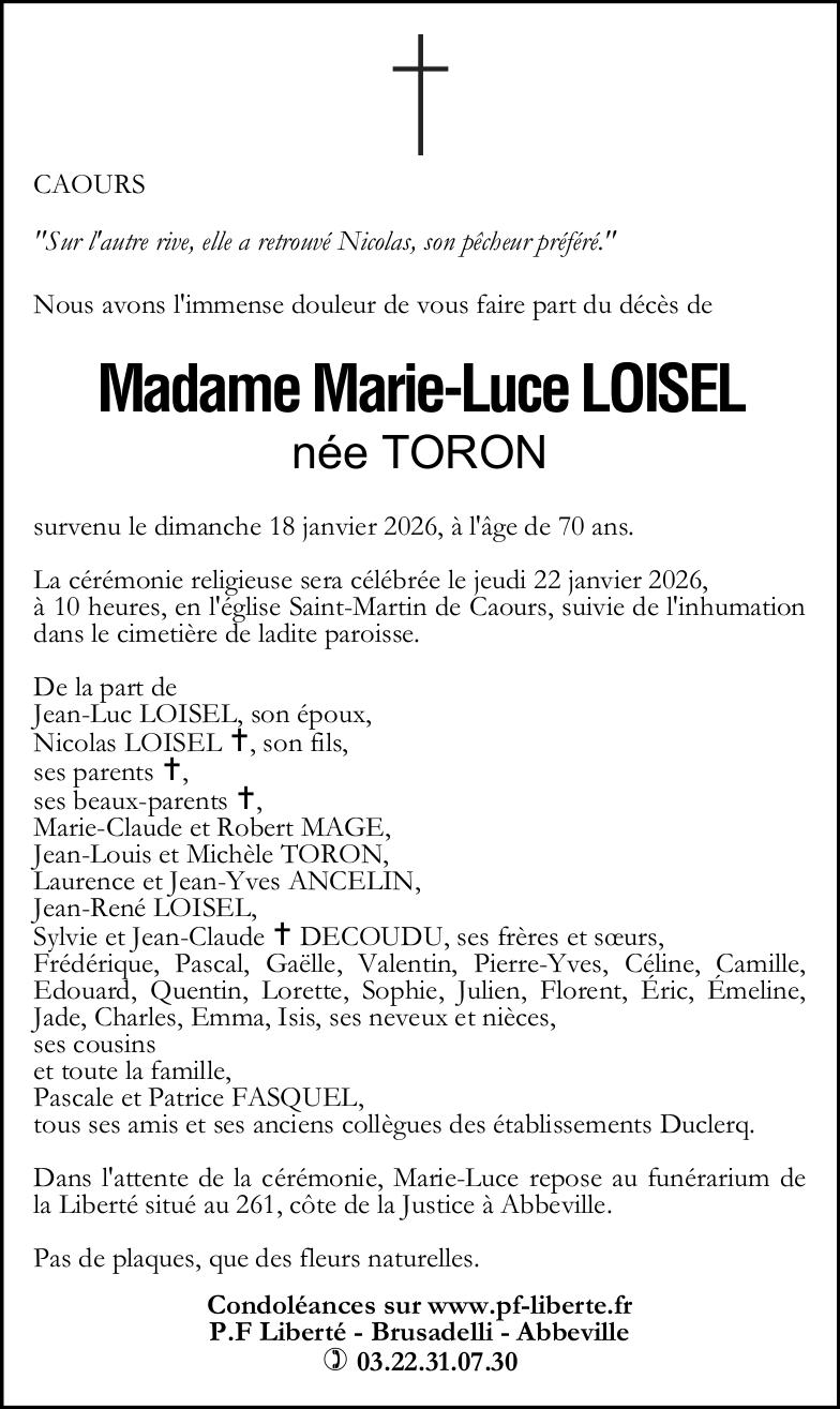 Avis de décès de Madame Marie-Luce LOISEL née TORON