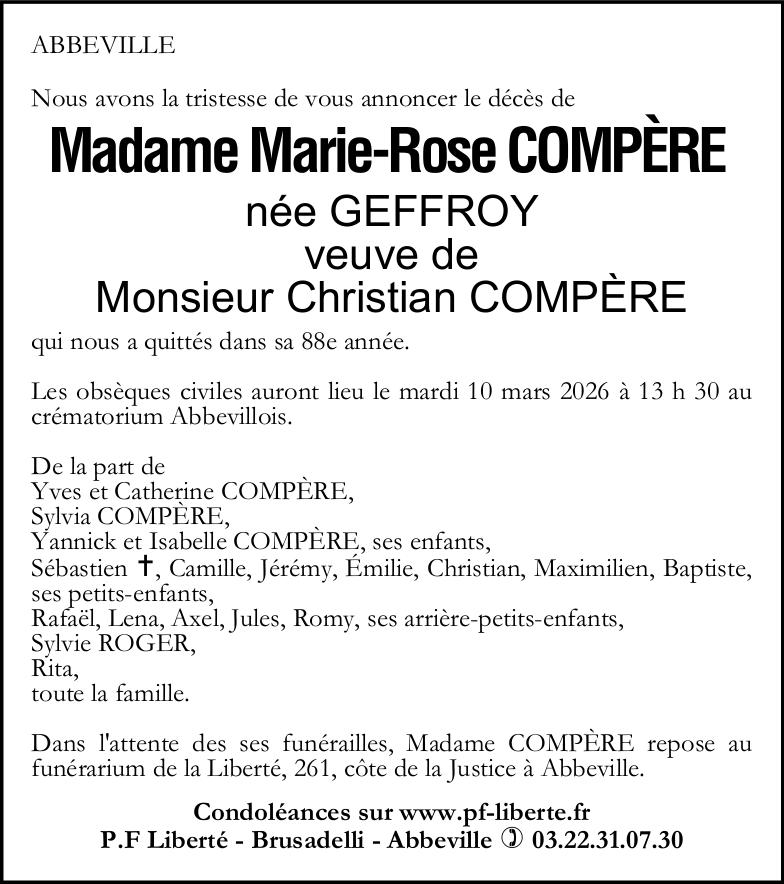 Avis de décès de Madame Marie-Rose COMPÈRE née GEFFROY