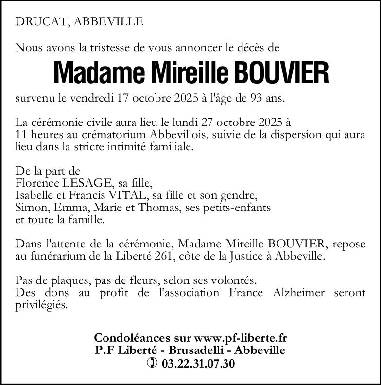 Avis de décès de Madame Mireille BOUVIER née BOUQUAIRE