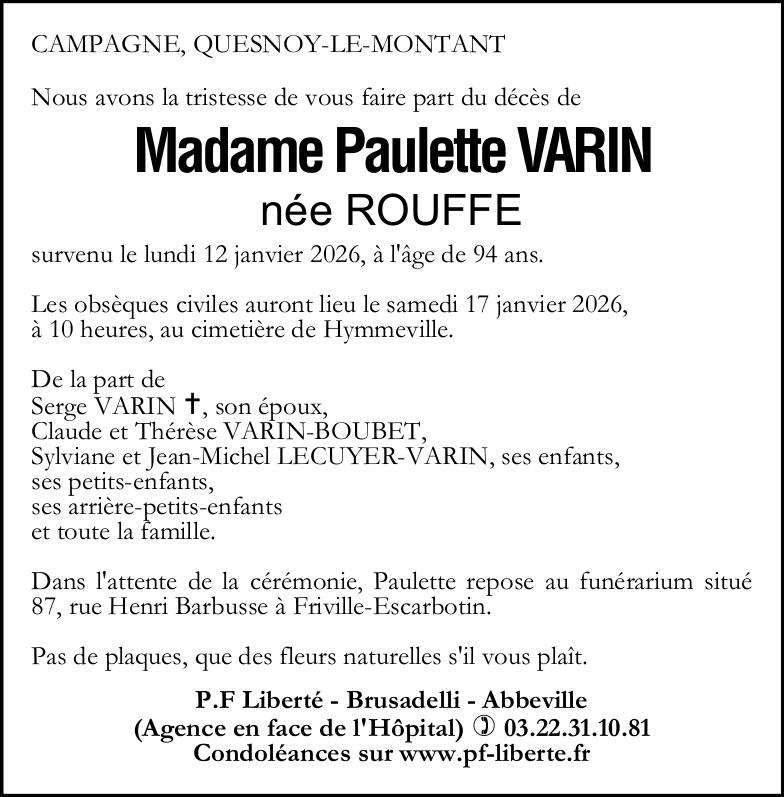 Avis de décès de Madame Paulette VARIN née ROUFFE