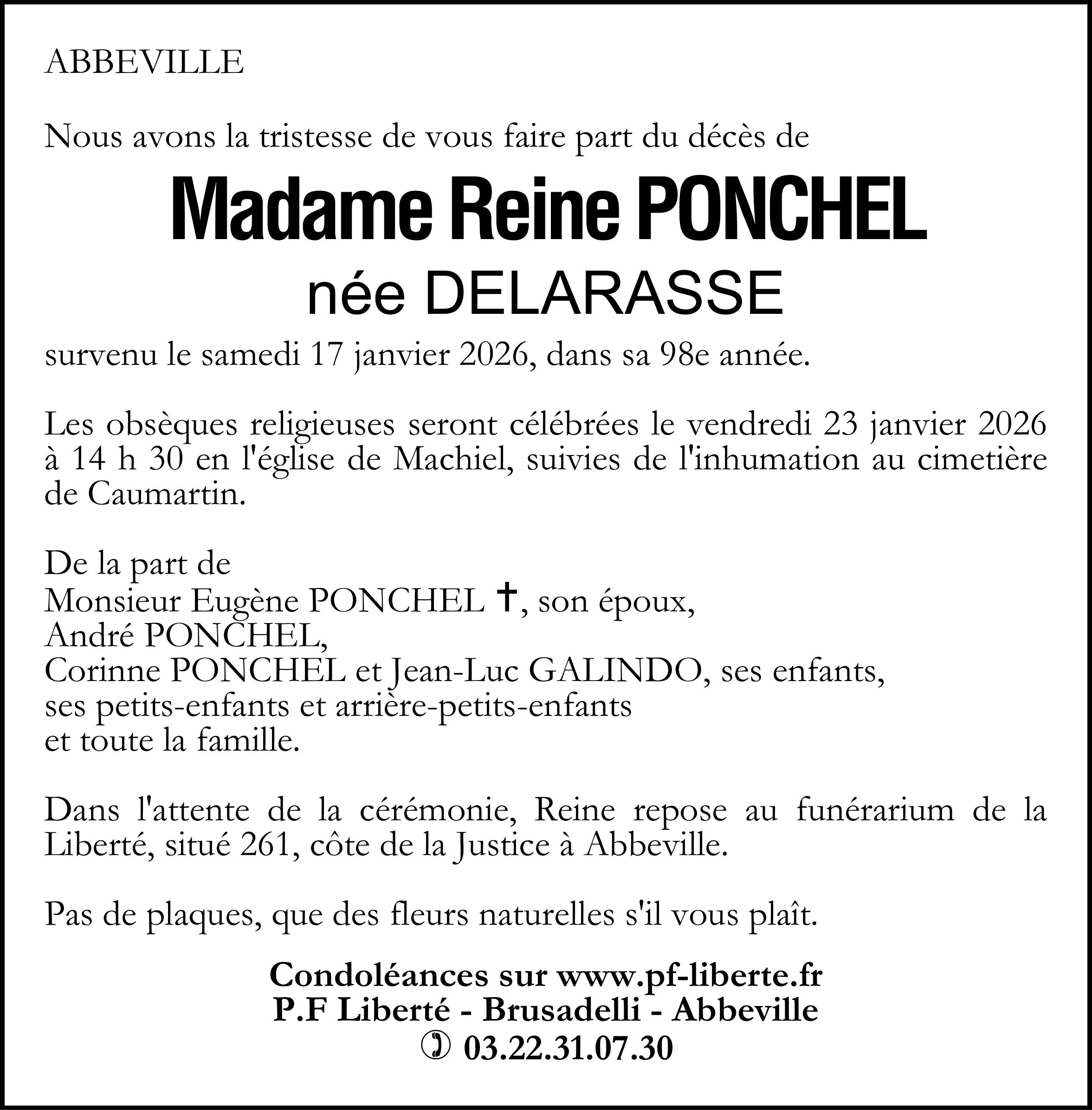 Avis de décès de Madame Reine PONCHEL née DELARASSE