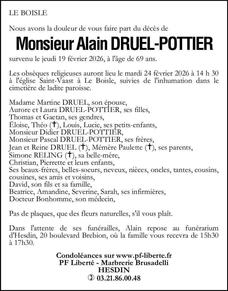 Avis de décès de Monsieur Alain DRUEL-POTTIER