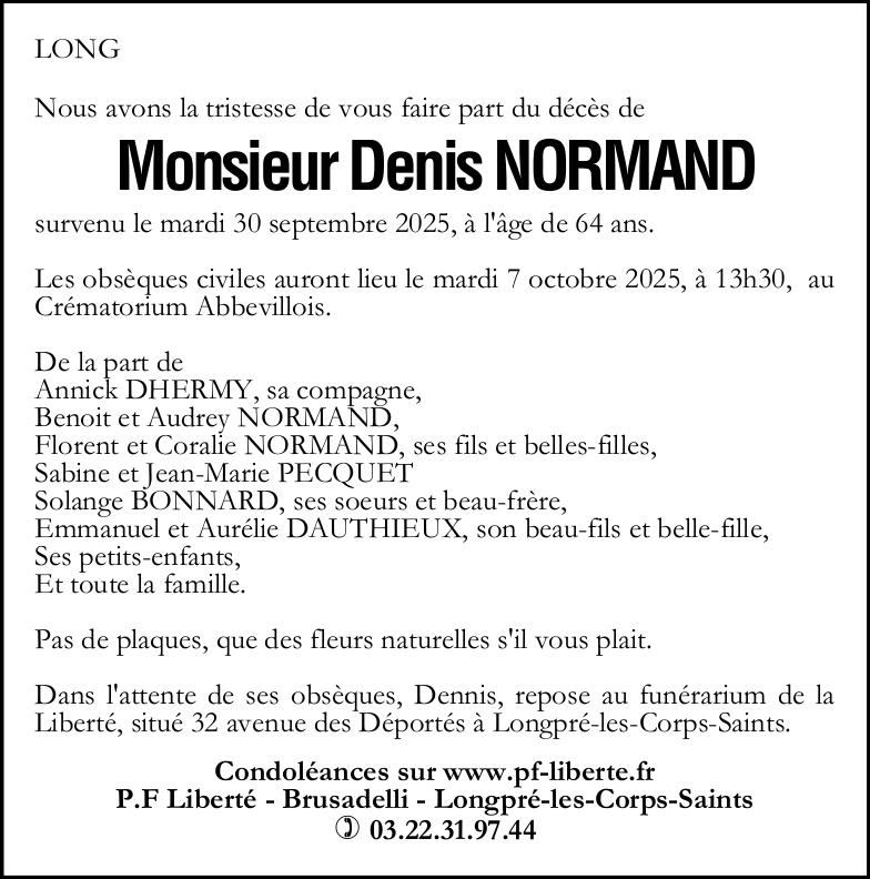 Avis de décès de Monsieur Denis NORMAND