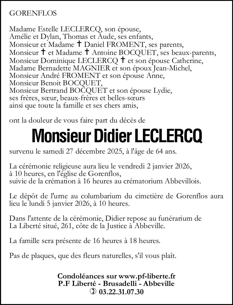 Déroulement des funérailles de Monsieur Didier LECLERCQ