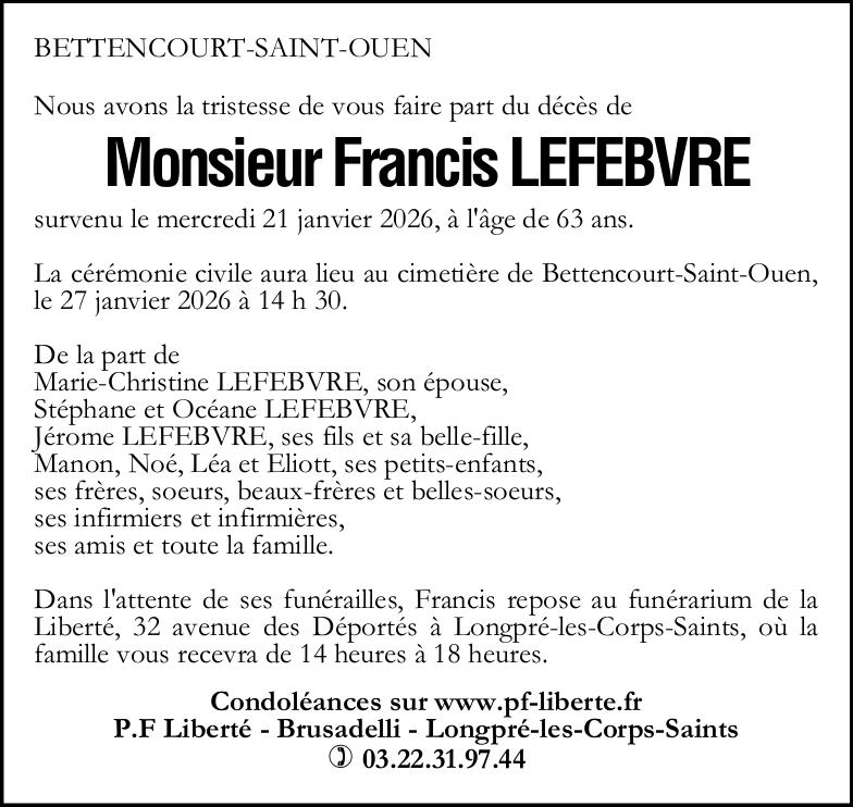 Cette page vous permet de présenter vos condoléances à la famille et de partager l'avis de décès de Francis.