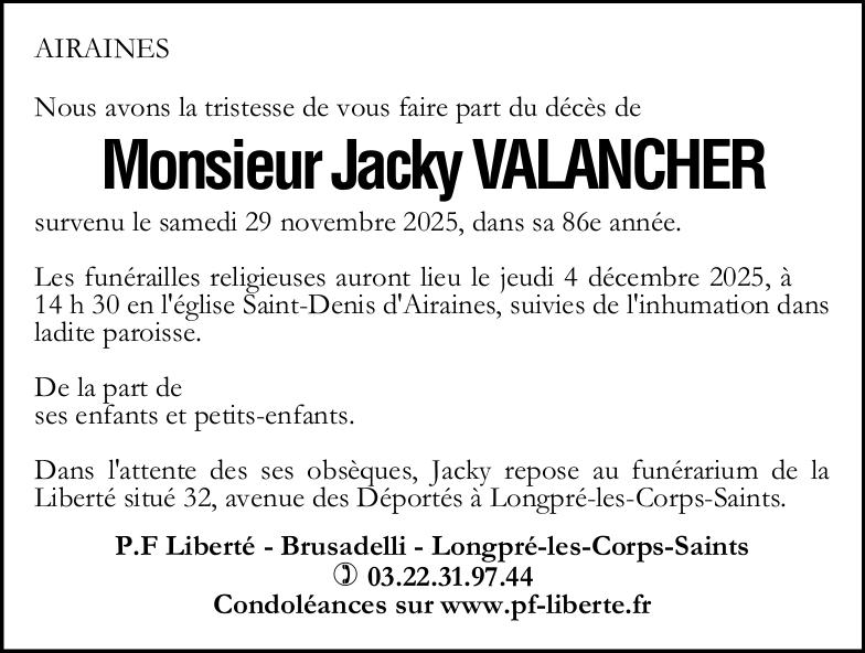 Avis de décès de Monsieur Jacky VALANCHER