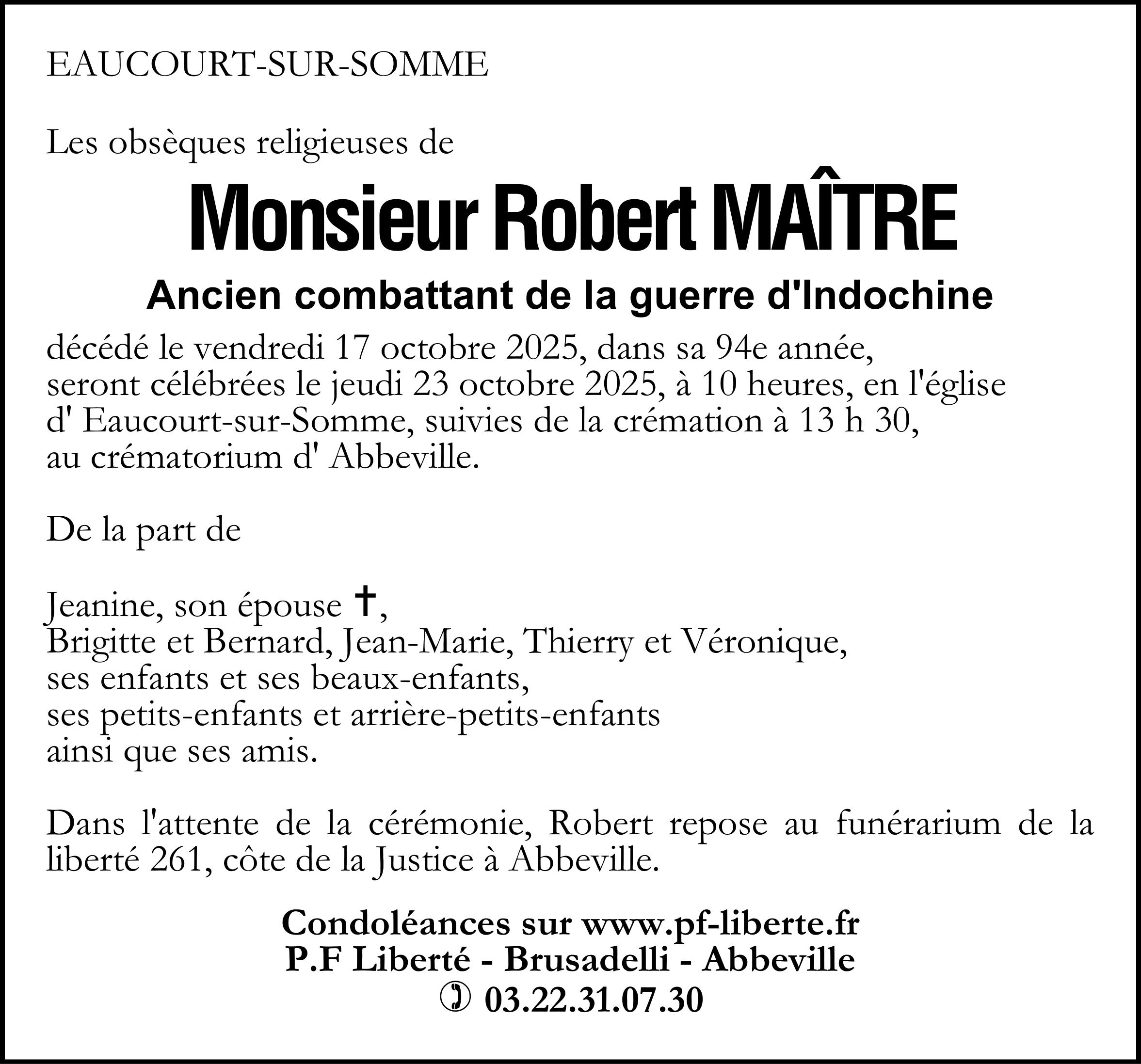Déroulement des funérailles de Monsieur Robert MAÎTRE